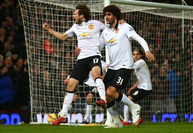 Selebrasi hasil seri | Blind merayakan golnya bersama Fellaini.